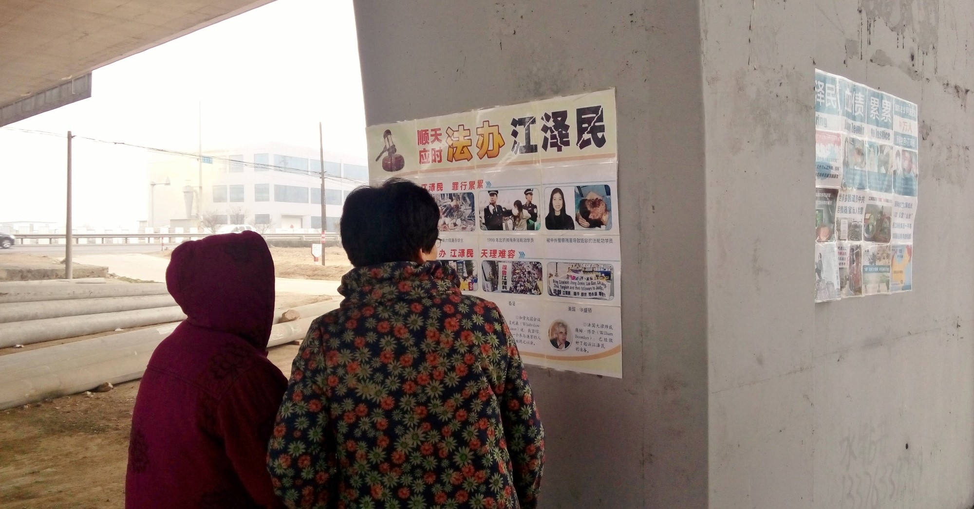 河北廊坊市街头的诉江展板、真相条幅、不干胶