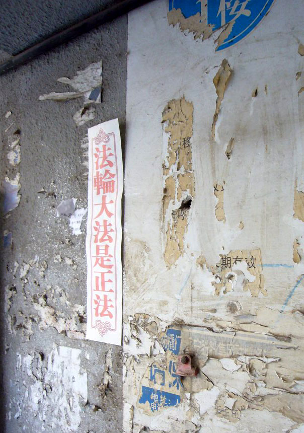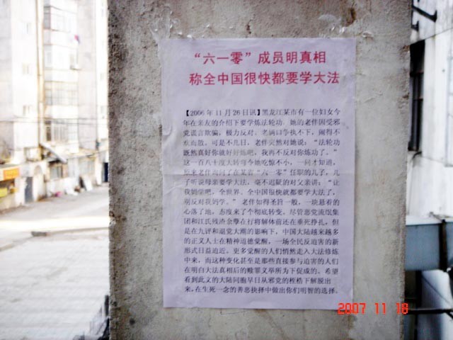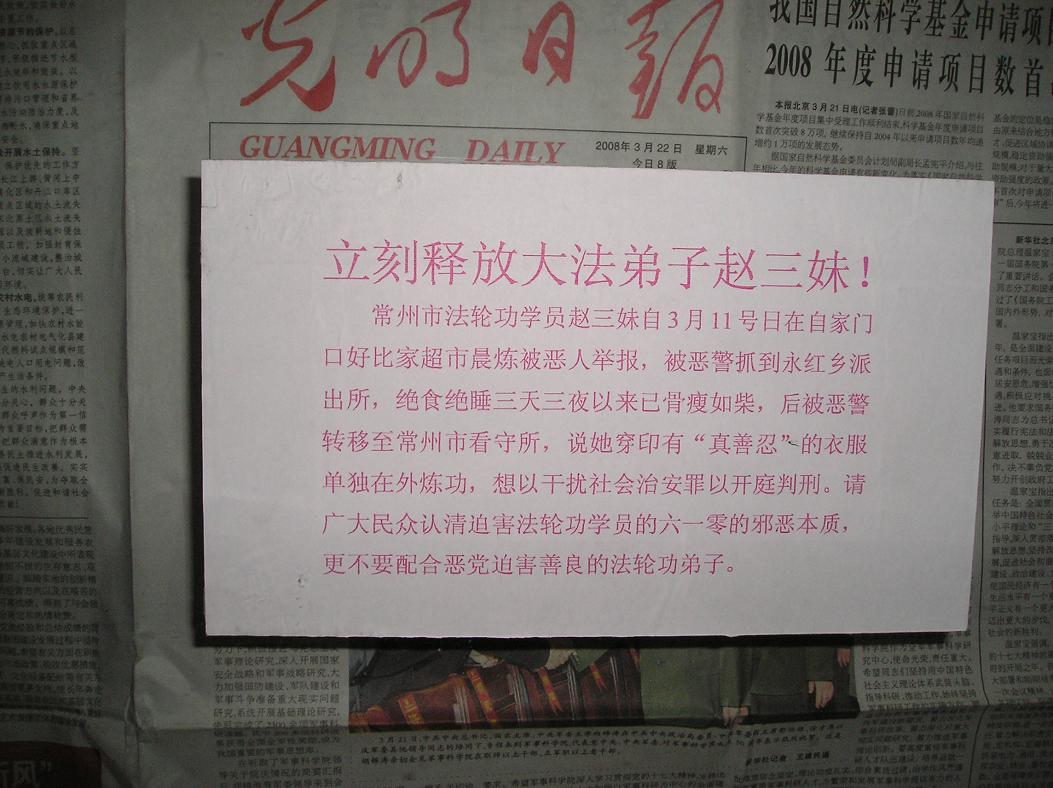 法轮功学员赵三妹遭恶警绑架图为学员在公园、报刊栏、派出所附近张贴揭露迫害真相