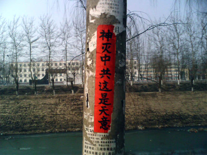 九江县火车站附近电线杆,出现宣传神韵晚会的不干胶