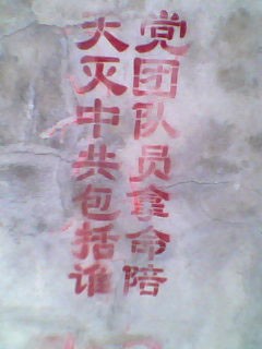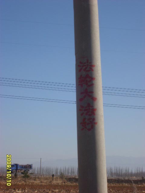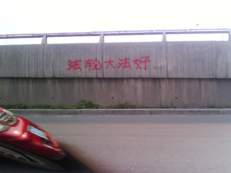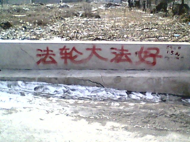 经历十年风雨的大法真相标语,黑龙江省某市市郊的一个工厂的后墙上