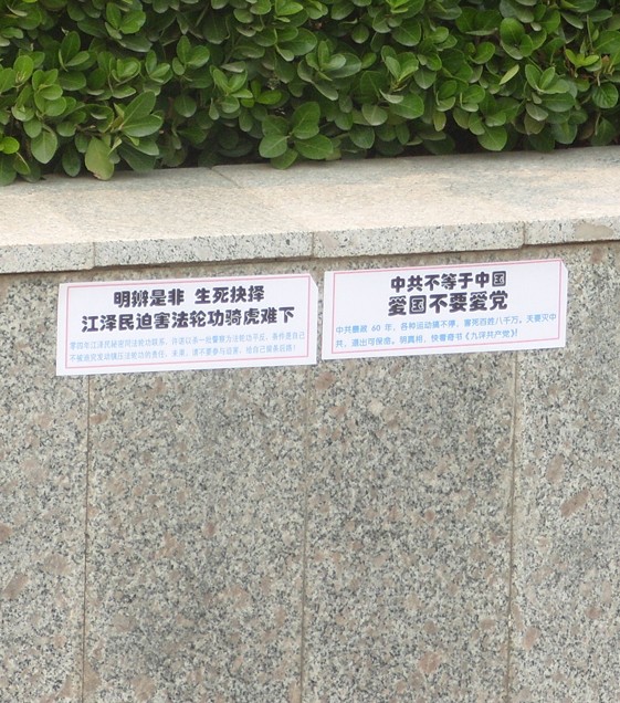 中国大陆法轮功学员挂出的真相条幅和贴出的不干胶