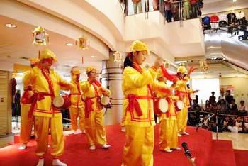 雅加达贸易中心大厦举办真善忍洪传世界图画与图片展览图为腰鼓表演