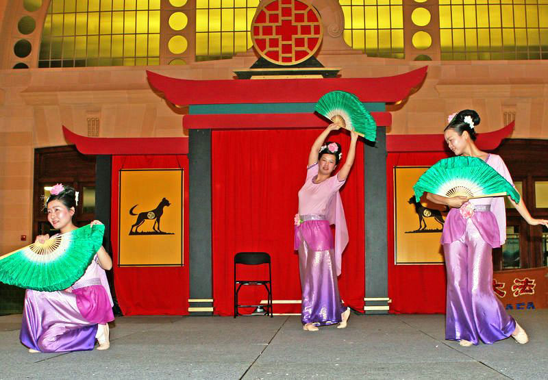 日本大法弟子隆重庆祝世界大法日图为学员表演富有民族韵味的《扇子舞》2007-5-13