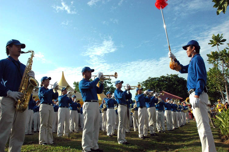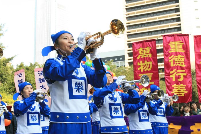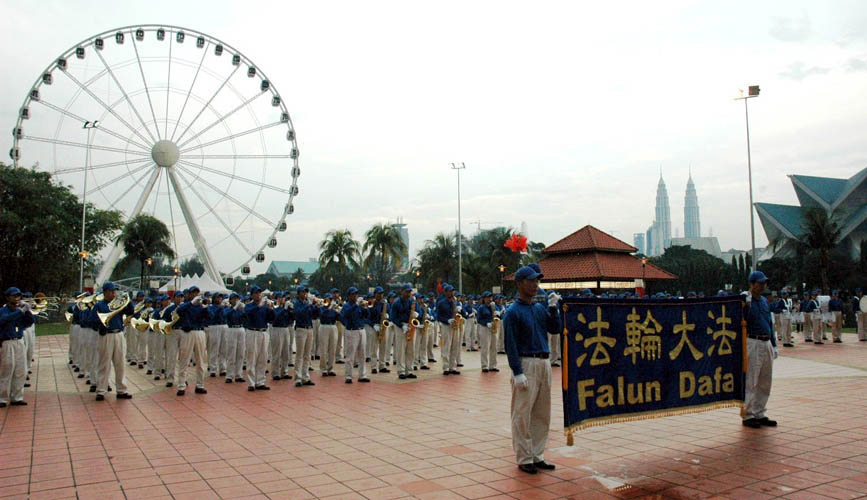 法轮功学员参加马来西亚国庆前的庆典活动图为天国乐团拉开庆典序幕.2007-8-30