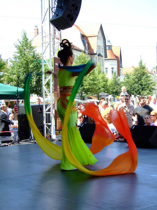法轮功学员参加德国Lindenau的社区庆祝活动图为独舞“敦煌”中飞天仙子轻舒彩带2007-6-9