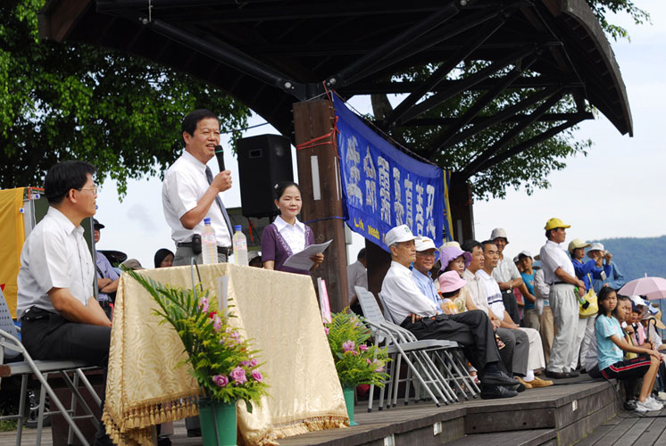 台湾法轮功学员组成的乐团表演受欢迎图为日月潭鱼池乡乡长廖学辉致词说希望大法带给社会祥和