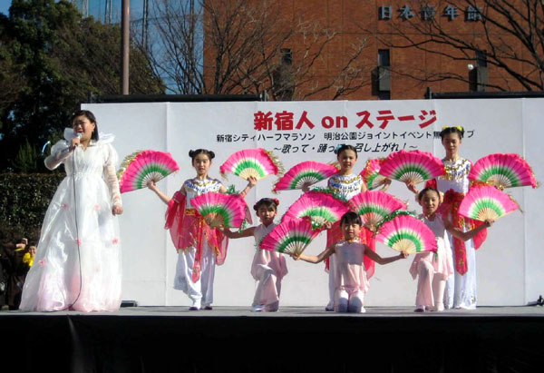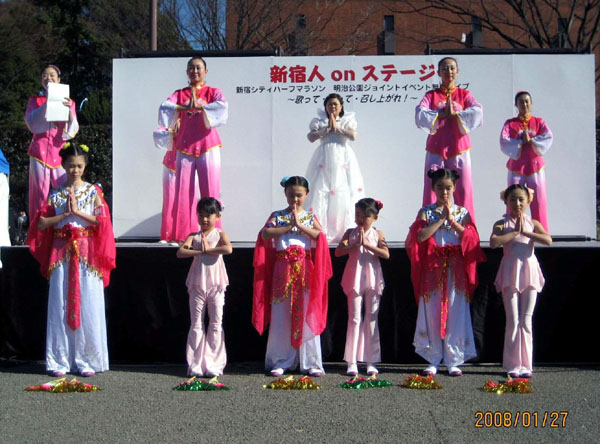 法轮功学员和明慧学校小弟子参加东京都明治公园的节日活动图为演出的场景2008-1-27