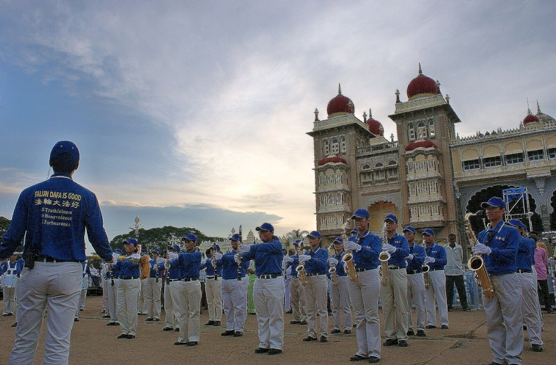 天国乐团在印度塔坝中国城踩街演出,学员向民众解说大法的美好