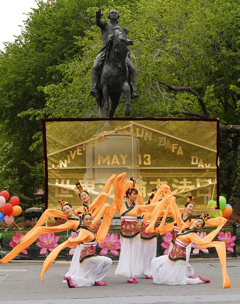 大纽约地区学员在曼哈顿联合广场,庆祝法轮大法洪传世界十六周年,图为中国传统舞表演 2008-5-11