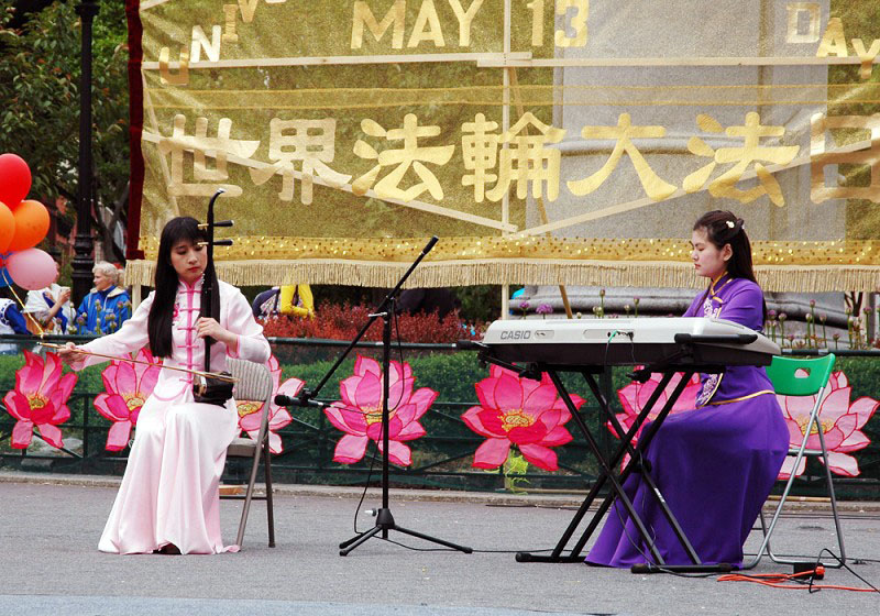 大纽约地区学员在曼哈顿联合广场,庆祝法轮大法洪传世界十六周年,图为乐器表演 2008-5-11
