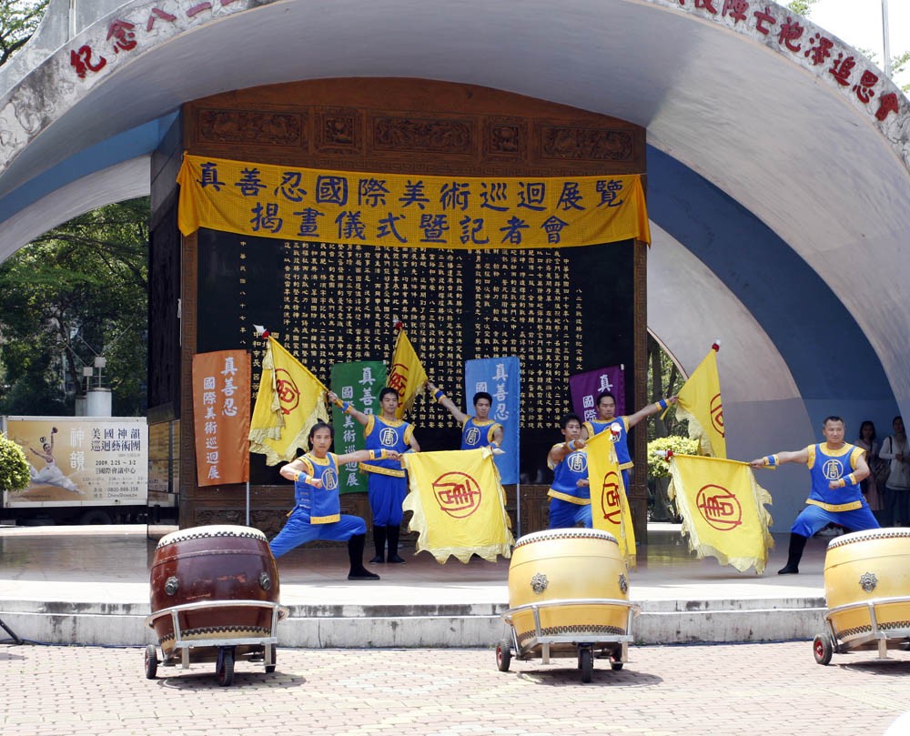“真善忍国际美展”在长庚大学隆重展出,图为天国乐团及旗鼓队为开幕示表演