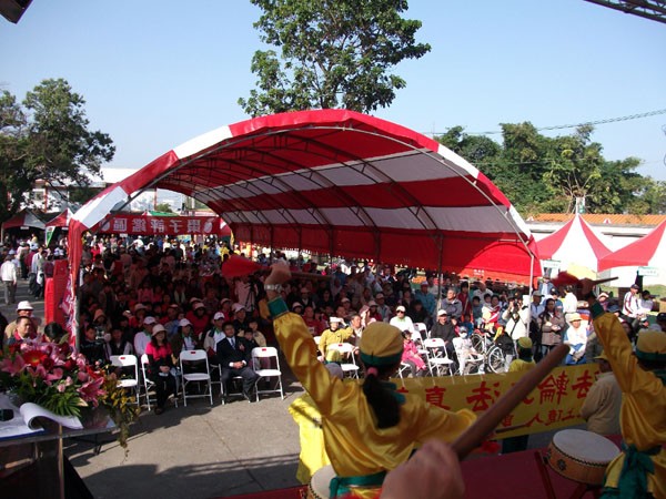 法轮功受邀高雄县文化观光季迎福年图为学员组成的腰鼓队及唐鼓队在台上演出,受到乡民的欢迎