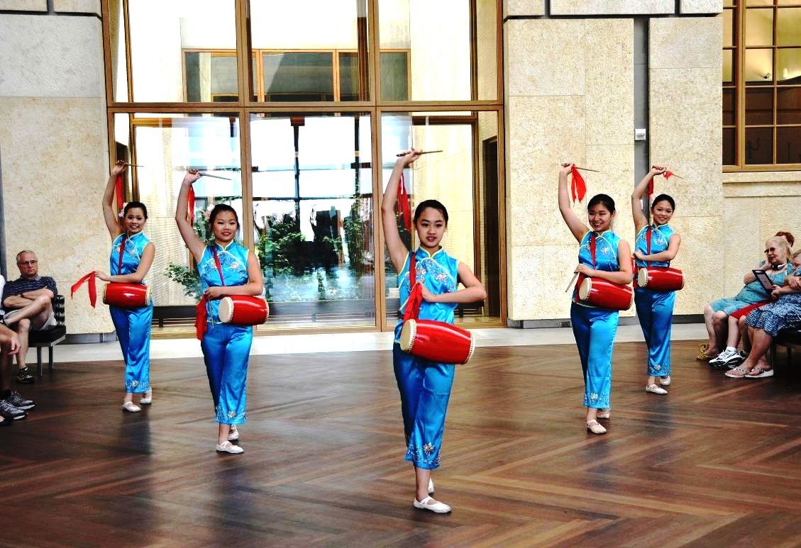 法轮功学员组成的腰鼓队受邀巧固球联合总部,庆祝落成揭幕典礼演出