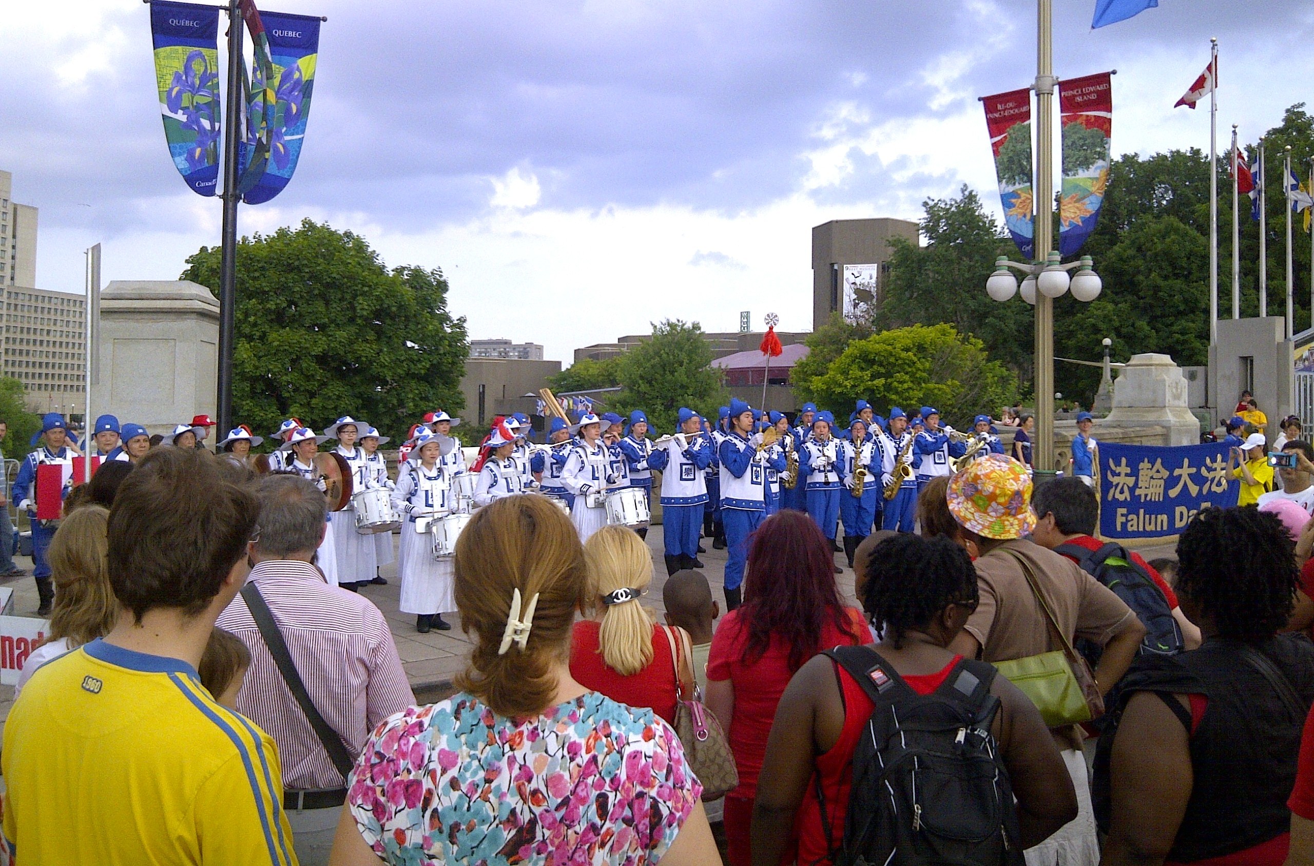 法轮功学员在国会山前举行加拿大国庆日的庆祝活动展示大法美好图为天国乐团的表演2008-7-1