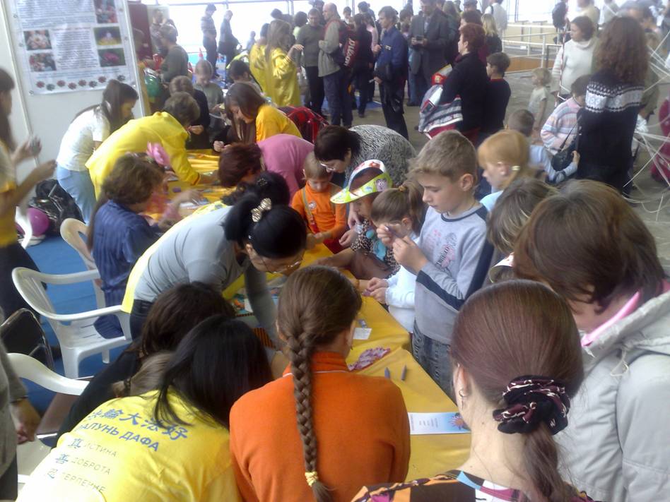 法轮功学员应邀参与俄罗斯儿童博览会,在会上洪扬大法图为民众在展位前了解真相2008-11-1至5