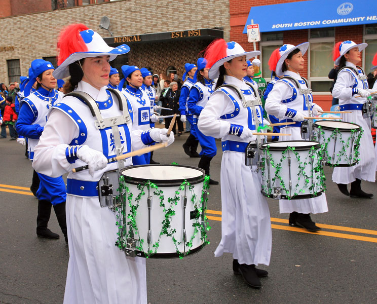 法轮功学员应邀参加波士顿的圣派翠克日游行天国乐团展风采,震撼人心2008-3-16