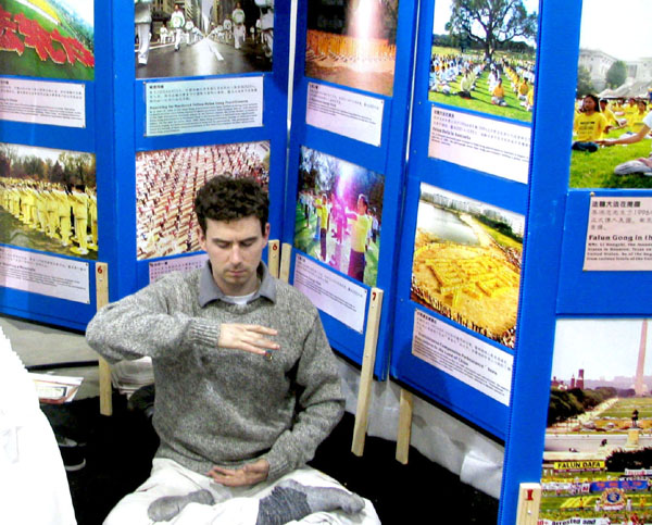 法轮功学员在健身、营养展览会设立了展位介绍法轮大法的美好,并免费教功。,