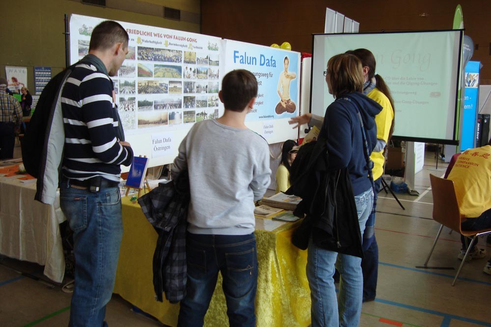 法轮功学员在不来梅健康展上介绍功法,吸引众多访客