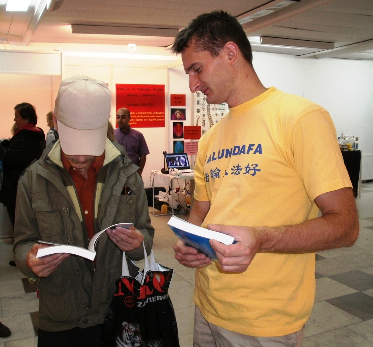 法轮功学员参加健康博览会,民众购买了《转法轮》,并留下联系信息