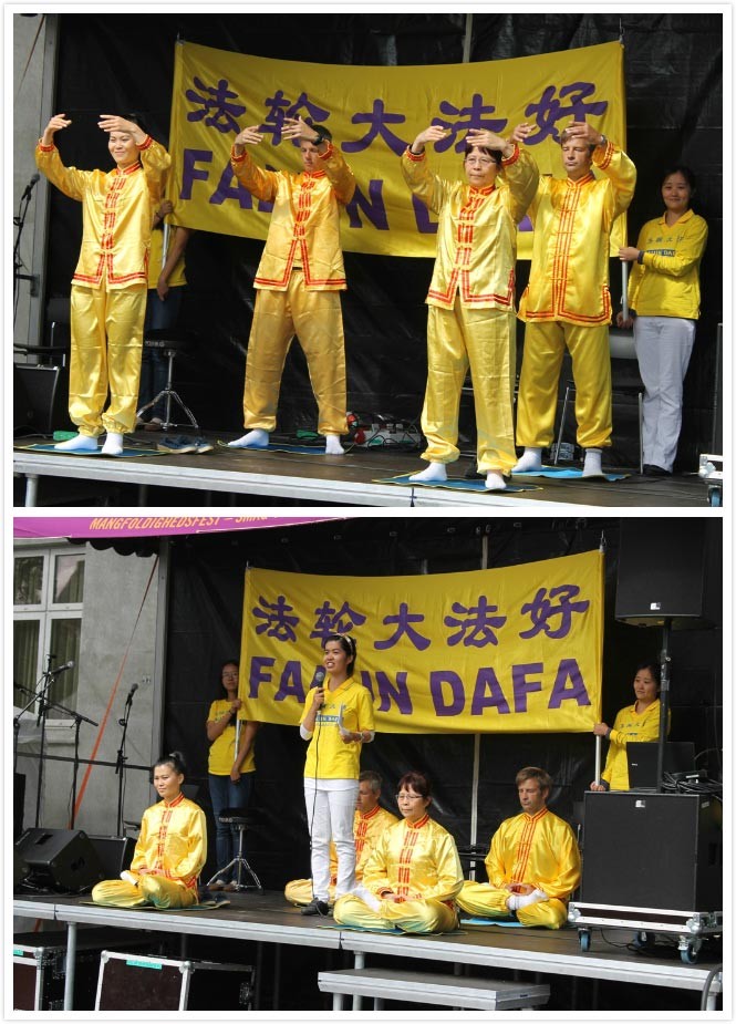法轮功学员应邀参加斯德哥尔摩市博览会,图为功法演示