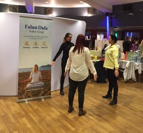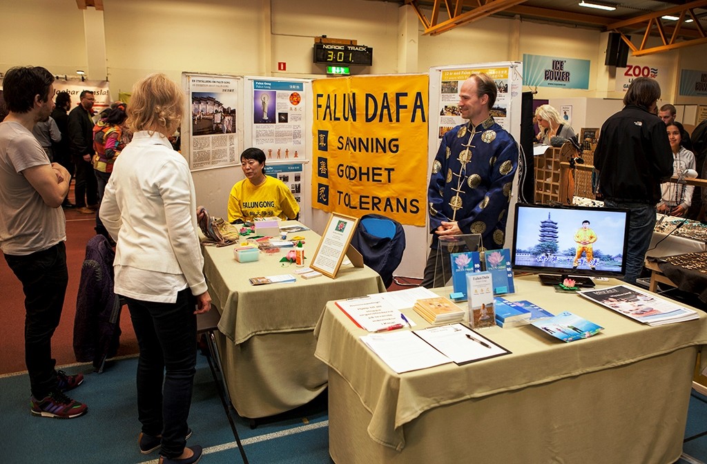 法轮功学员被主办方邀请参加健康展会,吸引着很多瑞典民众从