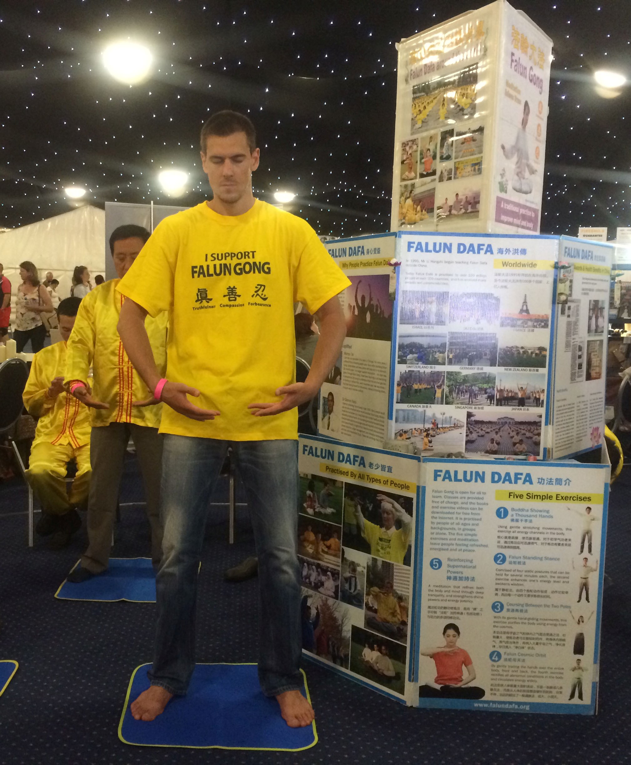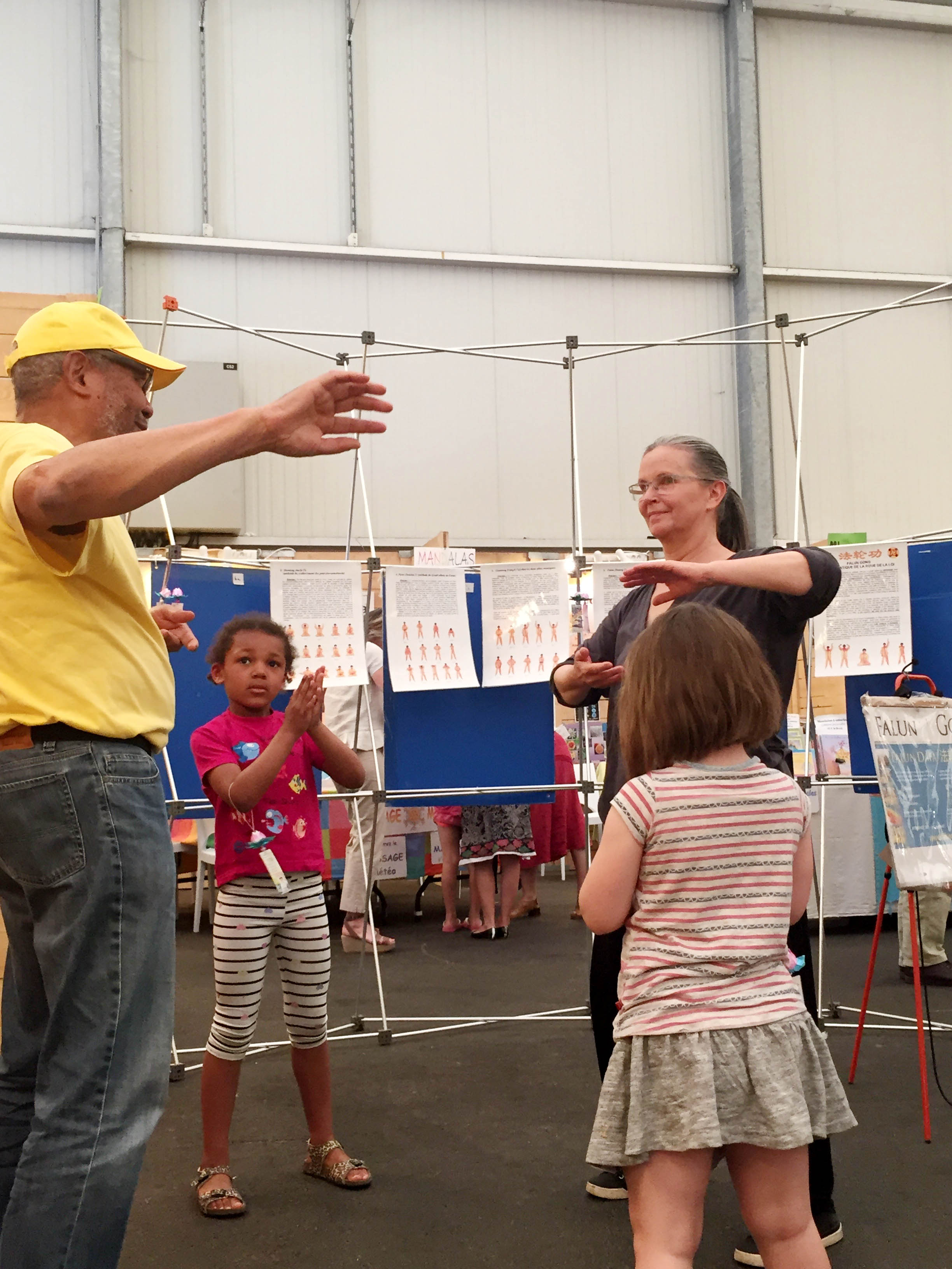 法轮功学员参加健康博览会,民众学炼祥和的功法