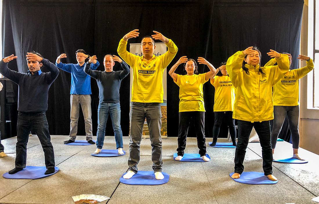 法轮功学员应邀参加健康展,演示功法吸引了许多民众学炼功法