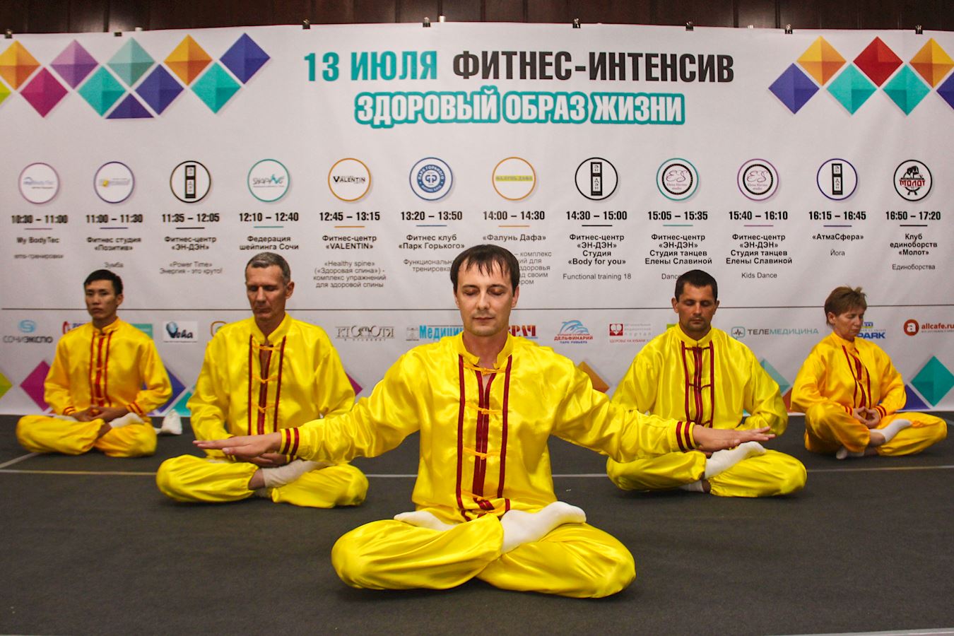 法轮功学员受邀参加在莫斯科举办的“东方集锦国际展会”图为舞台上展示五套功法