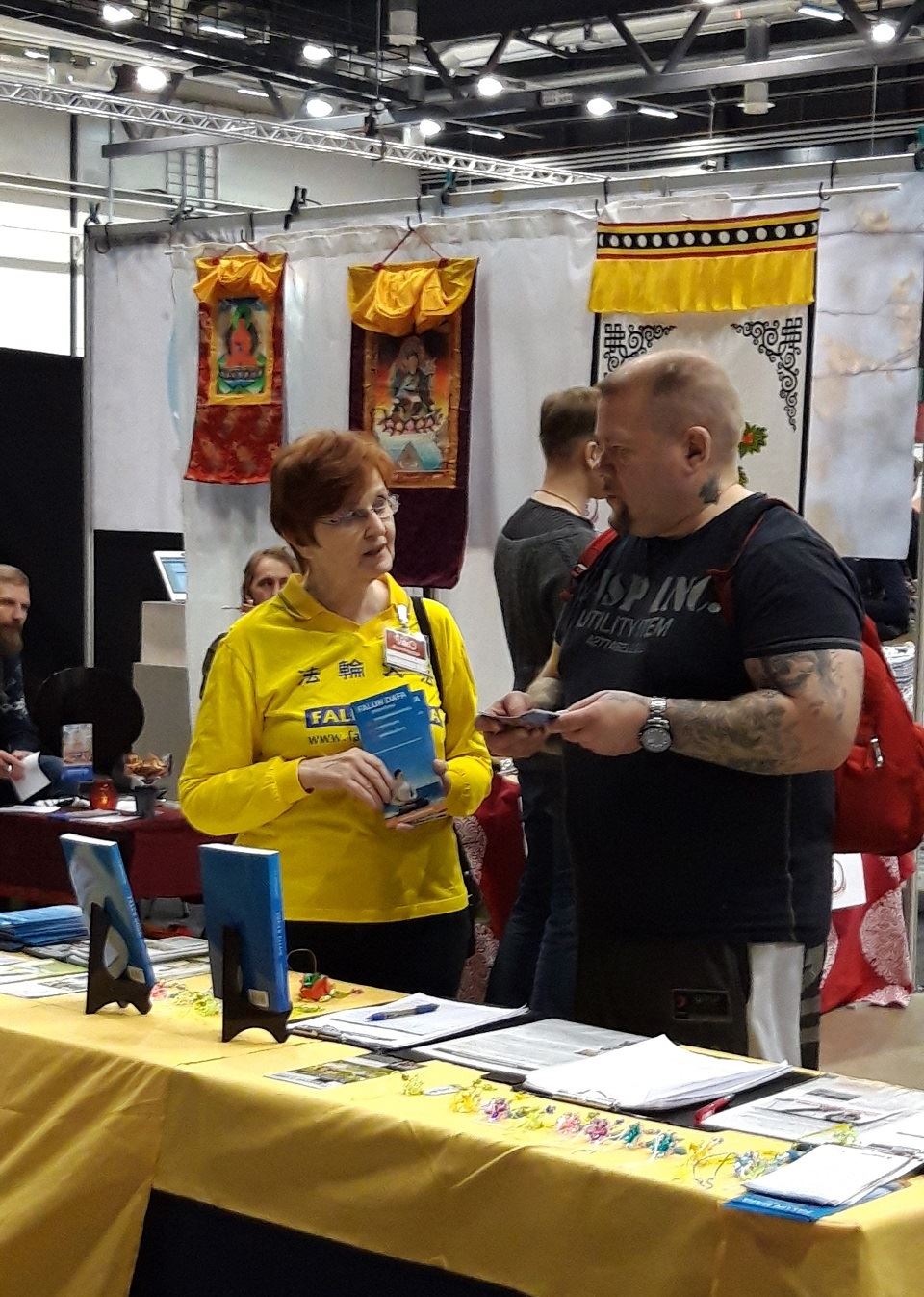 在芬兰首都赫尔辛基的Educa展会上介绍法轮功