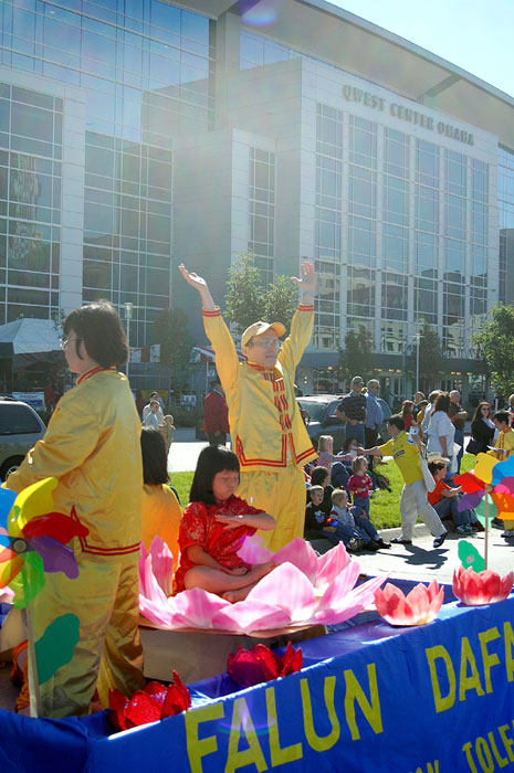 Published on 10/9/2004 美国内不拉斯加州法轮功学员参加奥马哈市“沿河城市牛仔节游行”(图)