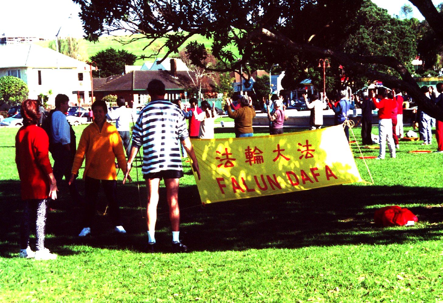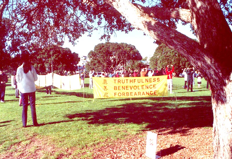 以色列法轮功学员在中国驻以大使馆对面的街道上弘法