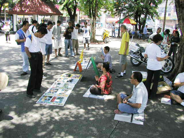 泰国法轮功学员皇后华诞日洪法 --- 很多过往游人高兴的接受了学员们准备的泰中文真相资料