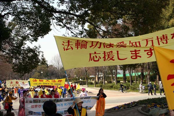 爱知万国博览会期间日本法轮功学员活跃名古屋 图为在通往会场路上的“勇气长城”