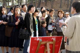 台北法轮功学员在中正纪念堂定期集体炼功洪法 图为游客虽然上了车眼睛还是盯着真相展板2006-1