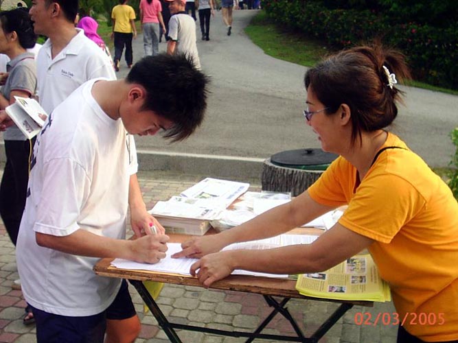 马来西亚法轮功学员在公园里洪法讲真相,市民们签名呼吁帮助停止在中国迫害法轮功学员