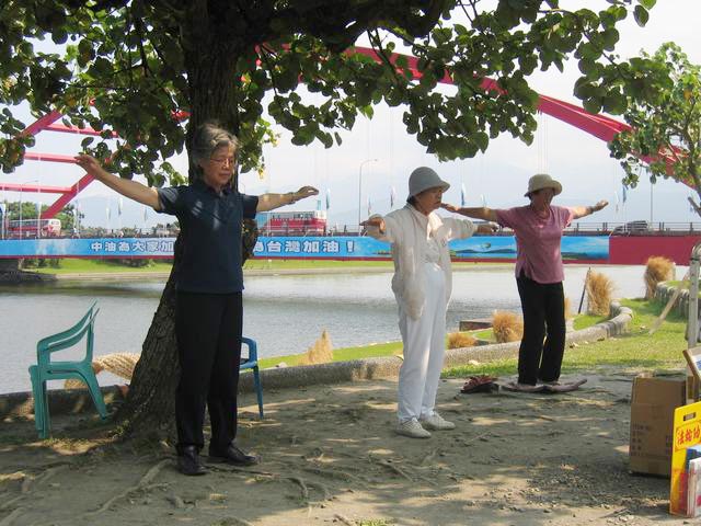台湾东华大学“法轮大法社”的法轮功学员在优美宜人的景点炼静功洪法