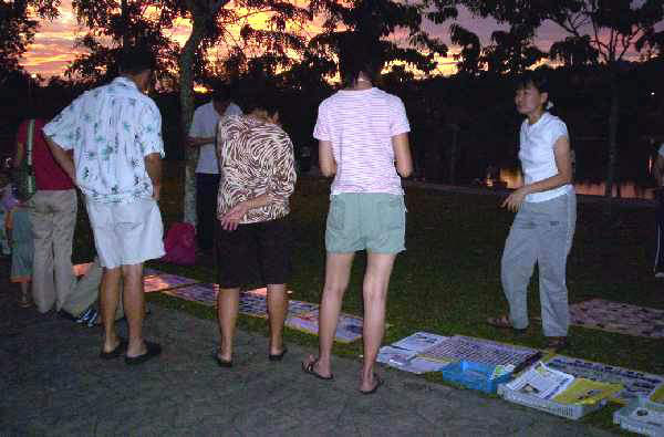 马来西亚新山法轮功学员在公园示范功法,同时摆放真相展板、洪法讲真相