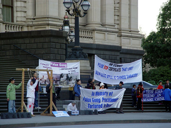 澳洲墨尔本法轮功学员在议会大厦前集会,声援法轮功学员起诉澳洲外长唐纳