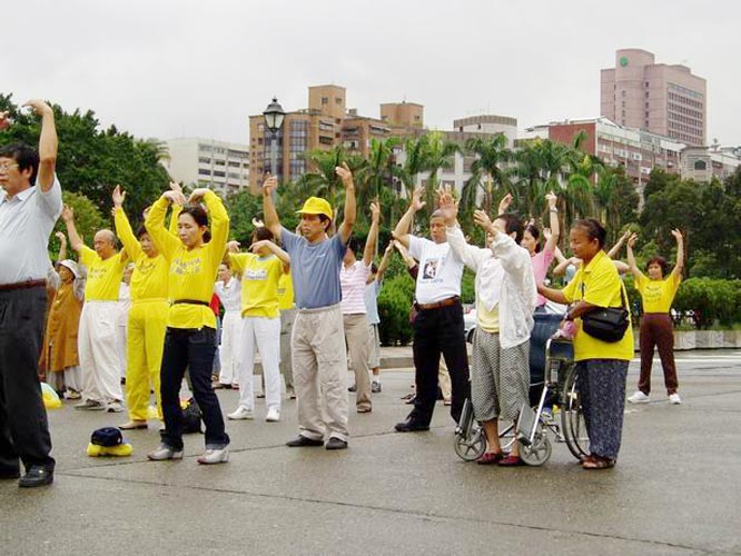 台湾法轮功学员在蒙蒙细雨中在国父纪念馆前集体炼功洪法