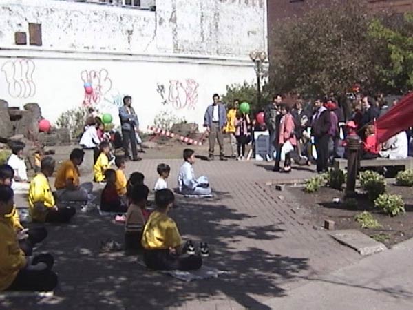 法轮功学员在蒙特利尔市中心公园欢庆世界法轮大法日和大法洪传十六周年,图为明慧学校的大法小弟子表演腰鼓 2008-5-17