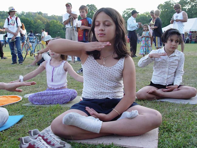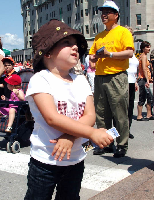 法轮功学员在国会山前举行加拿大国庆日的庆祝活动展示大法美好图为小朋友模仿功法2008-7-1