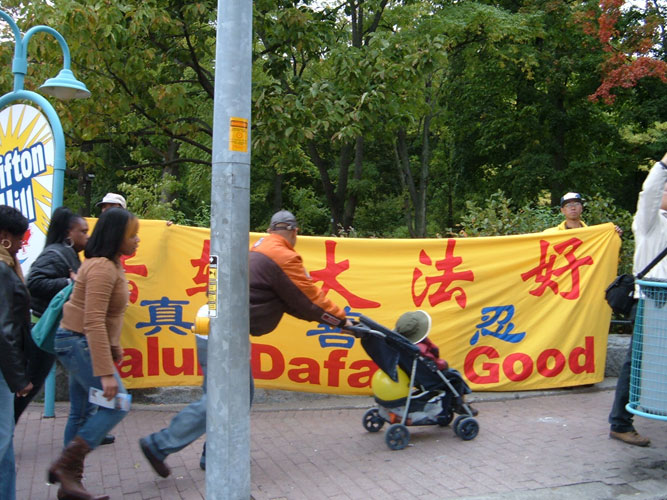 加拿大多伦多法轮功学员街头讲真相 图为马路对面的声援民众退党横幅 2006-10-14