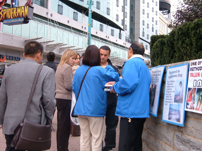 加拿大学员在维多利亚市中心揭露中共残害学员,盗售法轮功学员器官的兽行, 民众签名制止中共迫害 2006-4-8