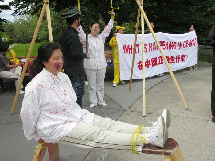 温哥华法轮功学员走上街头向民众讲真相 呼吁制止中共对法轮功的血腥镇压 图为酷刑演示