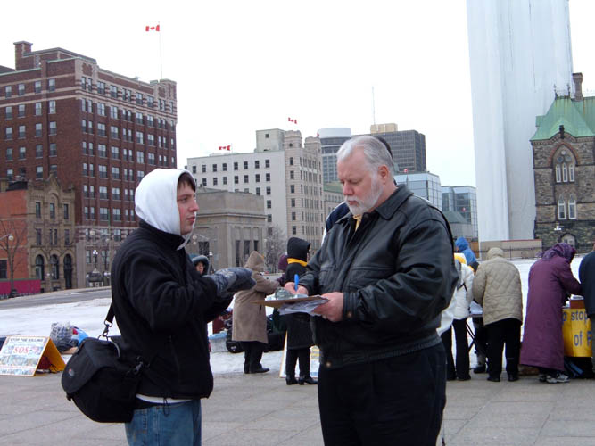 加拿大法轮功学员在国会山庄前做反酷刑展演示揭露中共对法轮功的残酷迫害 图为学员在讲真相征集签名