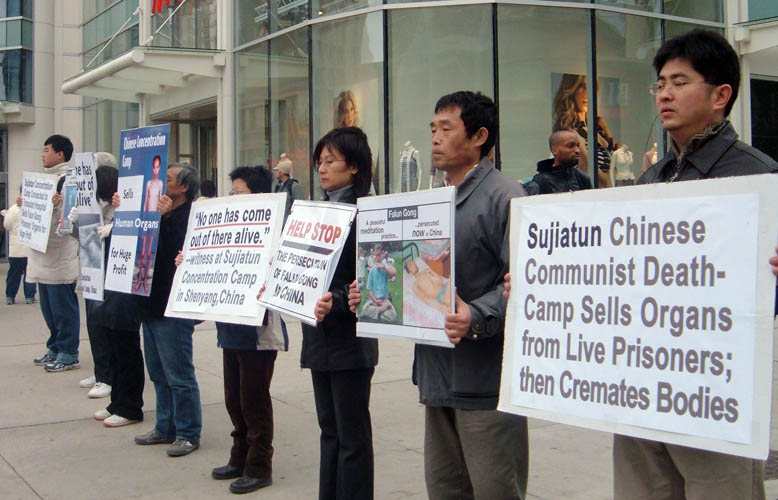多伦多学员手拿展板及横幅向路人揭露中共苏家屯集中营活体摘取并出售法轮功学员器官的真相2006-4-1