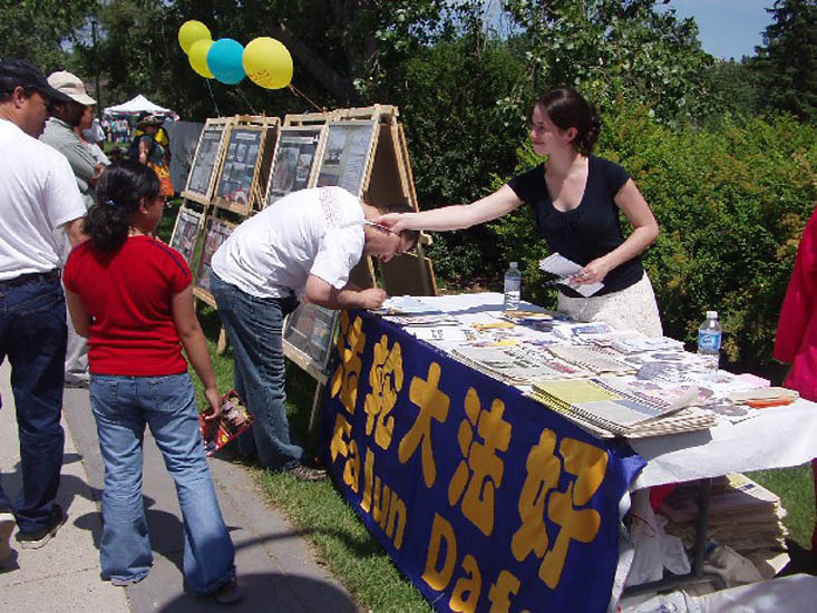 卡尔加里学员国庆日在公园洪法讲真相 图为游人观看法轮功真相展板2006-7-1