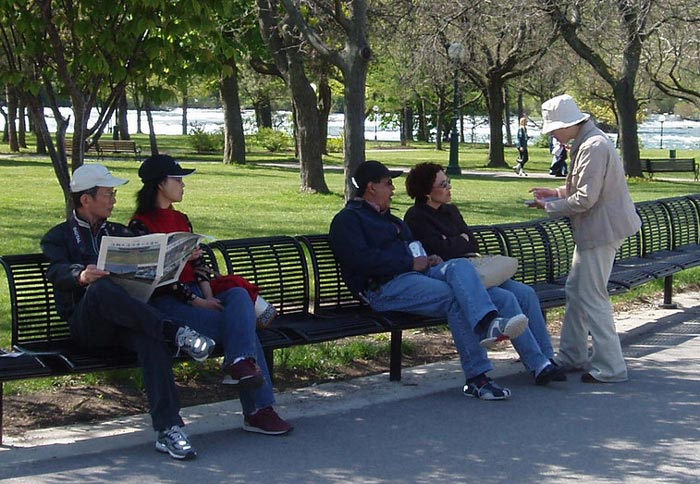美加法轮功学员前往尼亚加拉大瀑布 向胡锦涛和到访的中共官员呼吁停止迫害法轮功 图为向游客讲真相