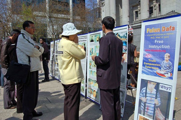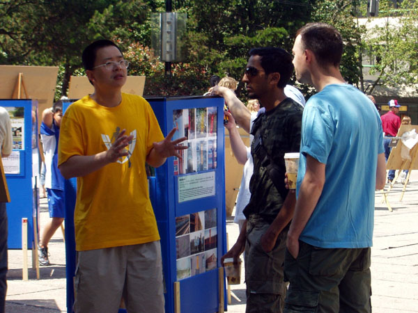 法轮功学员在加拿大多伦多市政府前的纳森.飞利浦广场庆祝世界法轮大法日,图为人们了解真相 2008-5-13