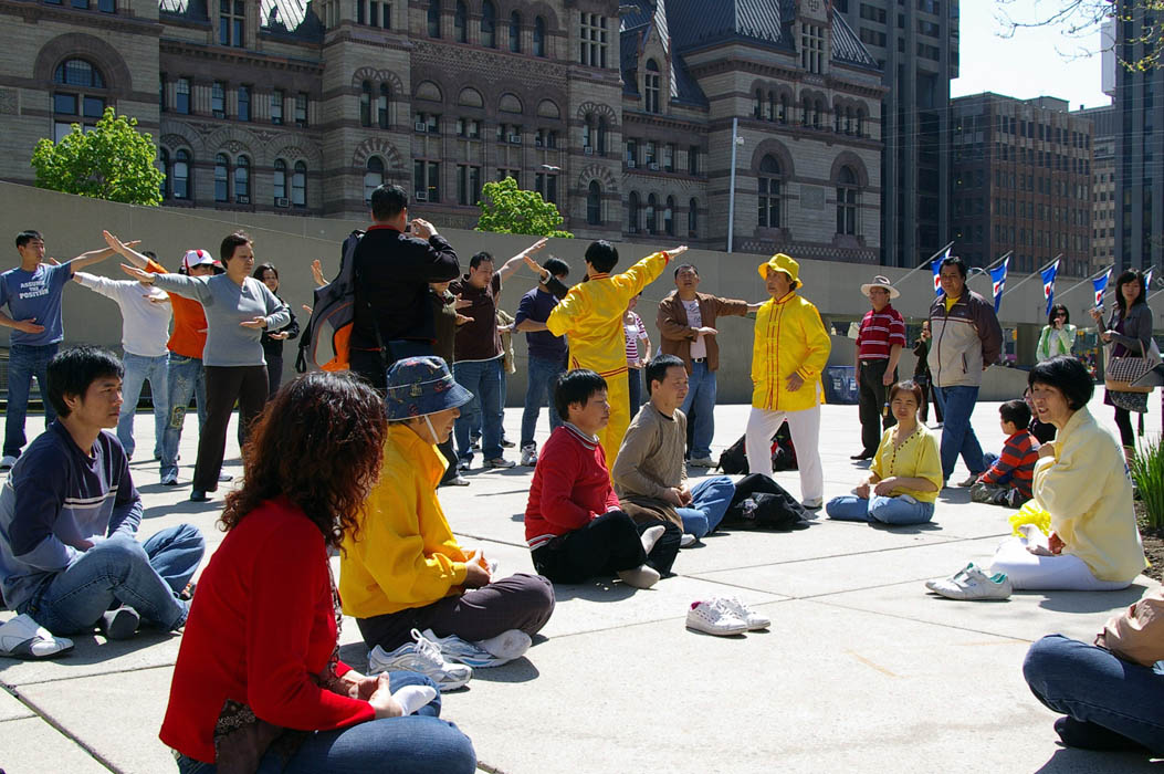 法轮功学员在加拿大多伦多市政府前的纳森.飞利浦广场庆祝世界法轮大法日,图为集体炼功 2008-5-13